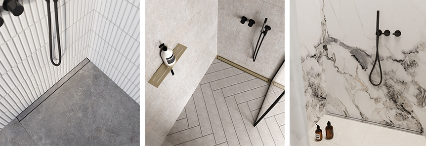 I Unidrains exklusiva och prisbelönta designserie ersätts det klassiska gallret av en panel av borstad stål. I sortimentet ingår även den diskreta HighLine Custom, där en klinker liknande det övriga golvet fästs för att skapa ett nästan osynligt avlopp.
